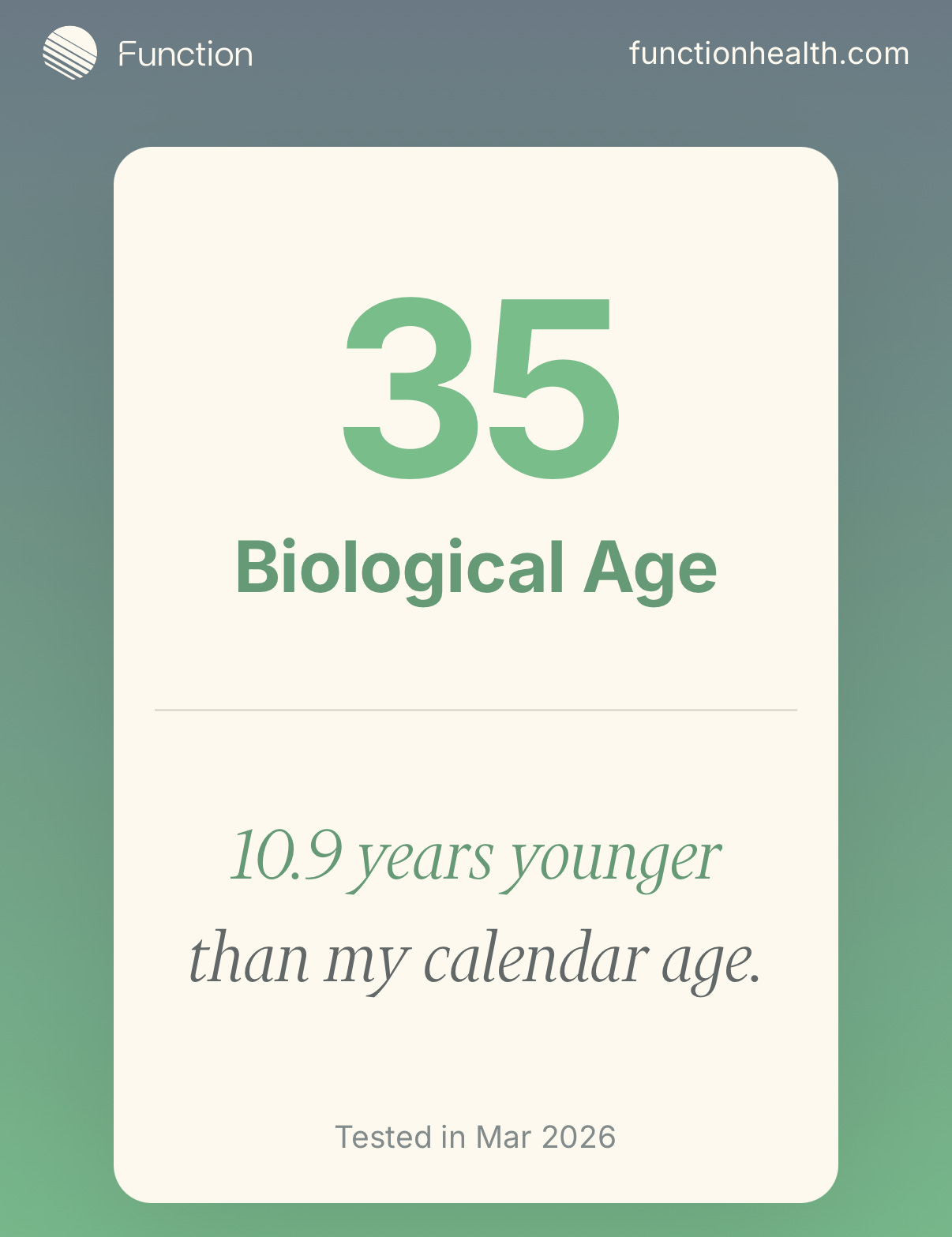 The most comprehensive and responsible thing I have done this year is sign up for Function Health. You get 2 super comprehensive blood tests a year, which is way beyond what a normal annual physical checks. It breaks everything down in a way that’s easy to understand, especially if you put in chatgpt. My friends and I like to compare certain biomarkers, and our biological blood age. Im 35.6! It’s my new kink. You can sign up and check out Function here.