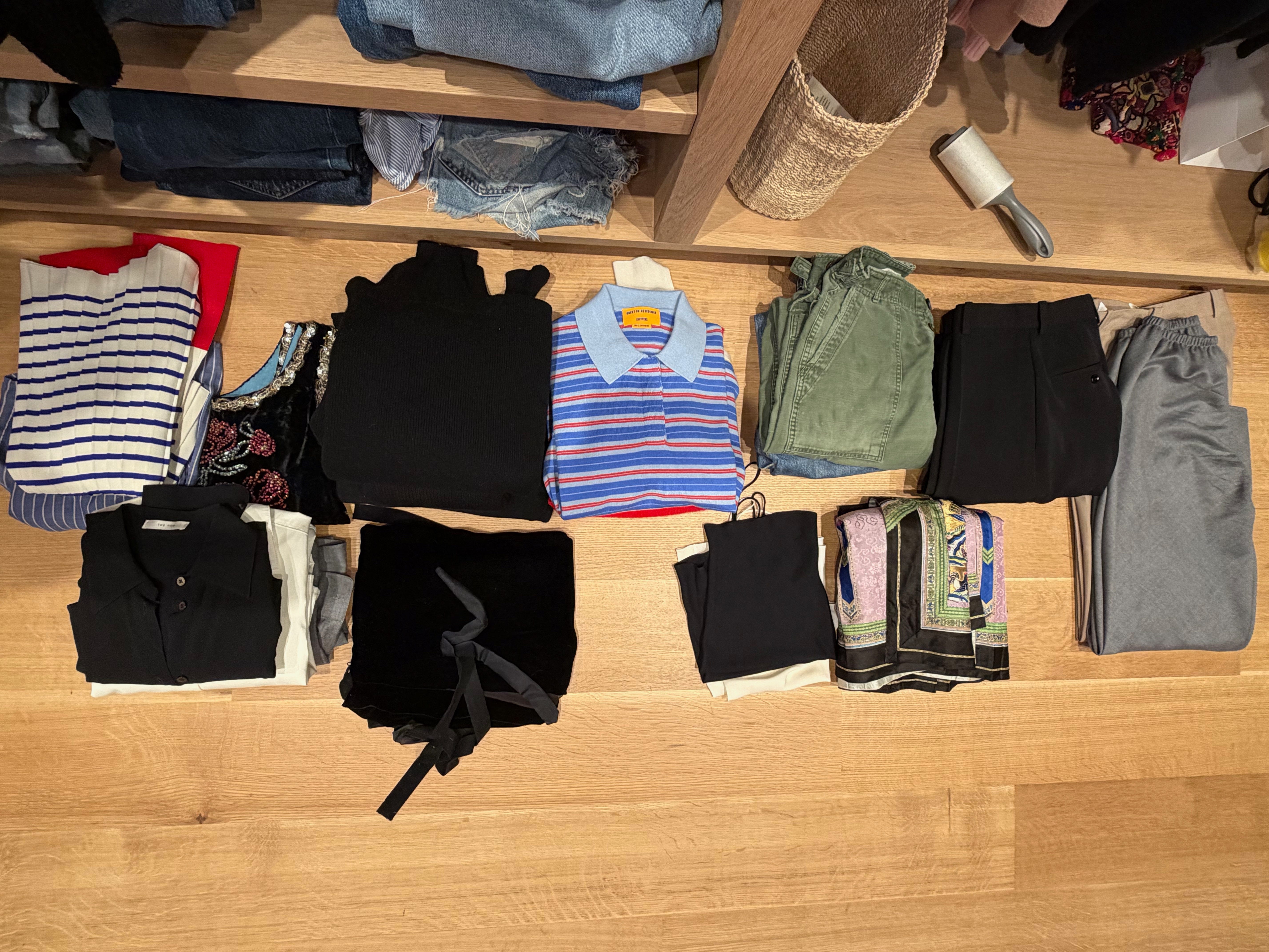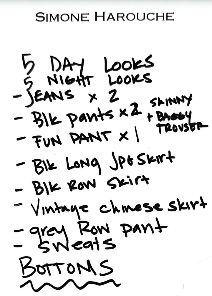 For bottoms: High sport kick pants, black trousers, cargo pants, two pairs of jeans, and a few skirts — my vintage Chinese wedding skirt, a black velvet vintage Jean Paul Gaultier skirt, and my long black Row skirt.