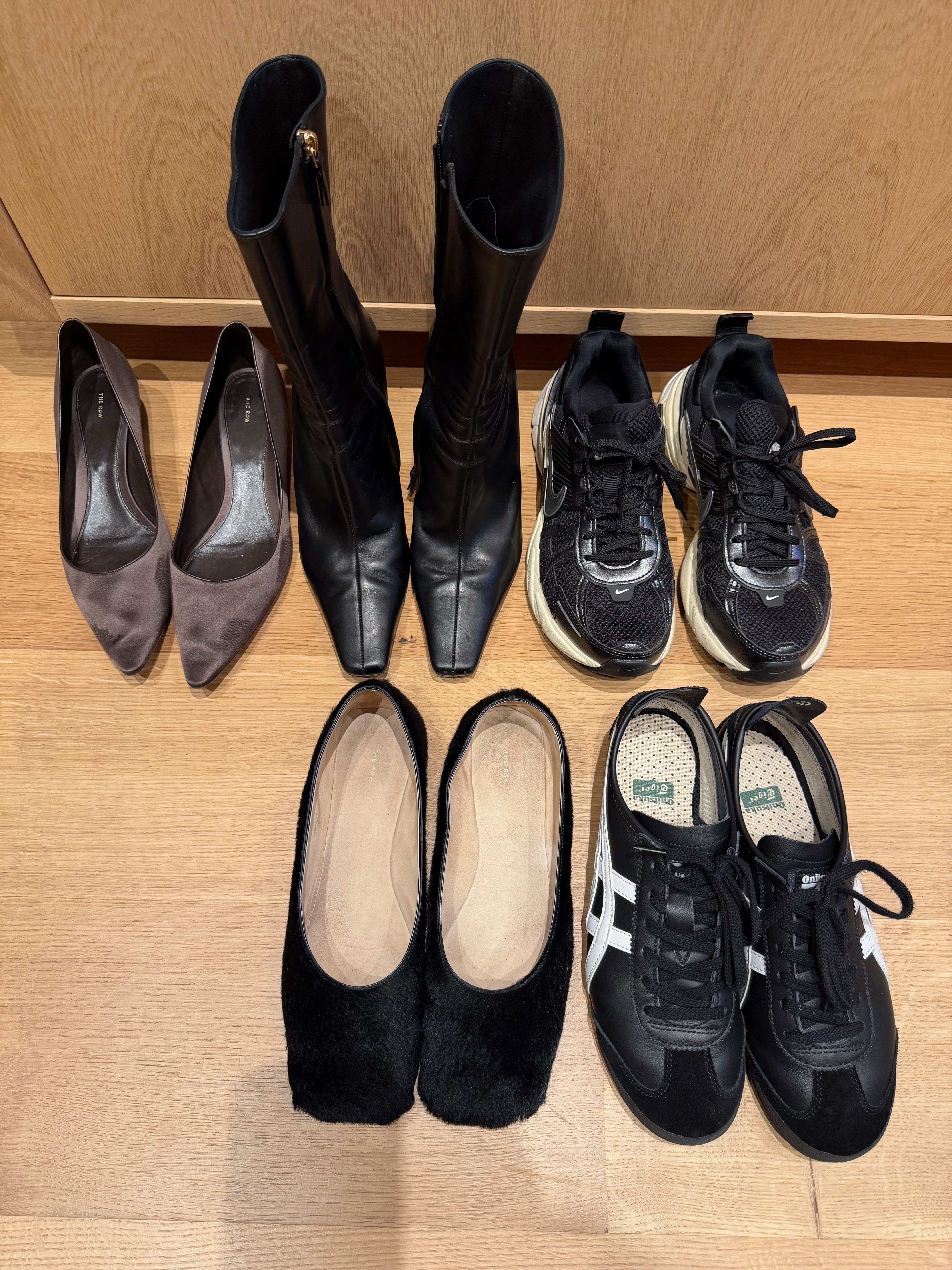 Five pairs of shoes: my Tigers, Nike V2Ks, my Row boots, and my Liisa pumps.