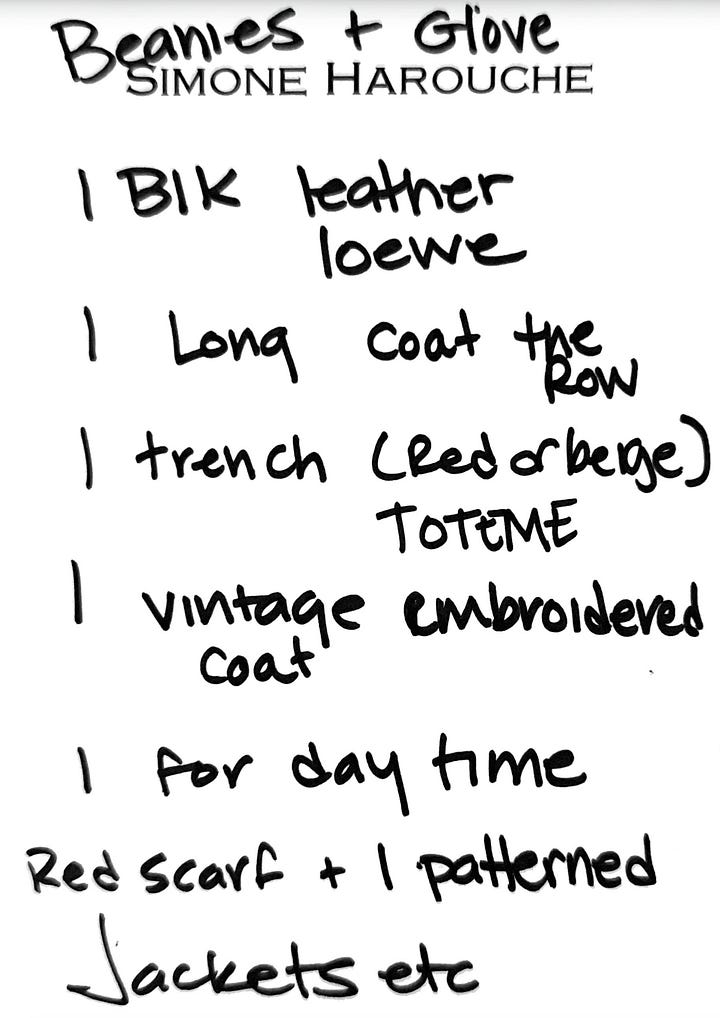 For outerwear: my red Toteme trench coat, my black Loewe leather jacket, a vintage black trench and a silk embroidered dust jacket… and I plan to buy a couple more shells and outerpieces while I am in Paris, so I will go light with packing here.