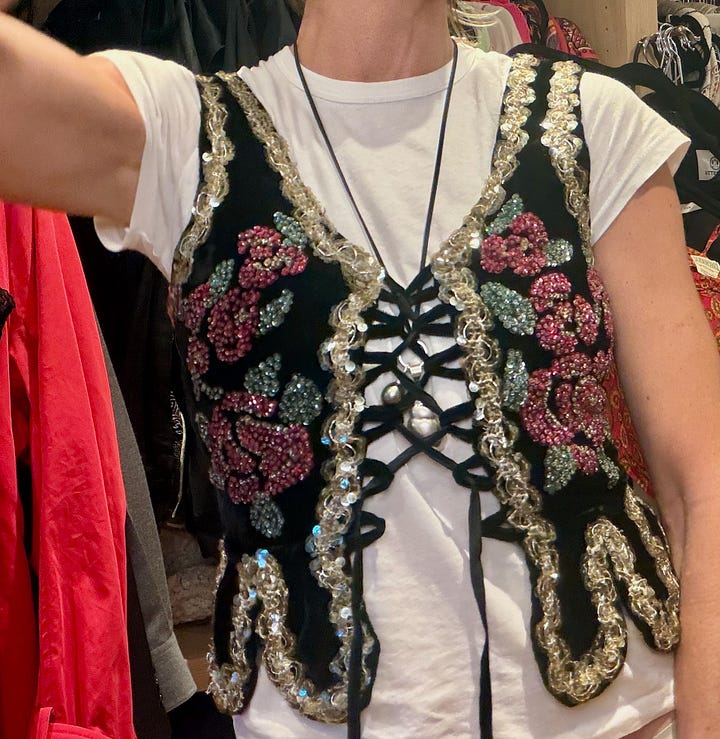 Then a couple fun tops: a velvet embroidered top and a Celine sailor knit with the red sleeves (maybe it’s too on the nose and will need to be sacrificed).